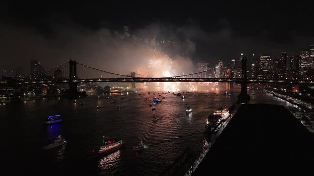 Night drone view of Macy's Fourth of July fireworks celebration in New York
