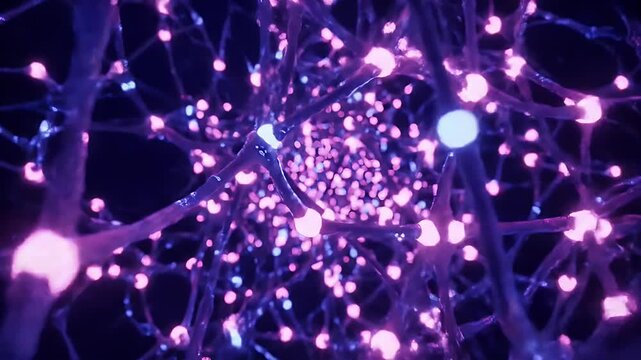 Cinematic 4K animation of a glowing blue neural network with firing synapses, visualizing brain activity, artificial intelligence (AI), and consciousness
