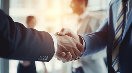 Smiling businesswoman shaking hands with ceo at corporate office.