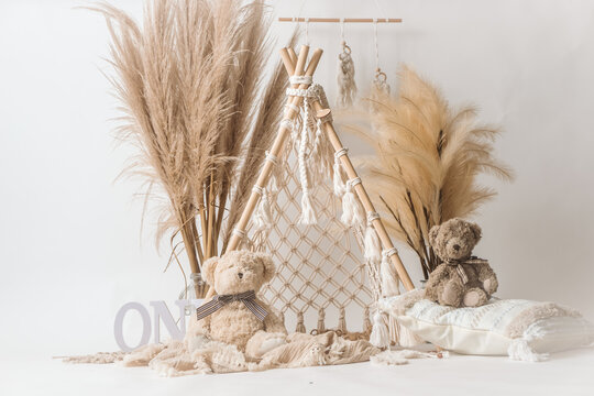 Set of First birthday watercolor invitation card for boy and girl. With plush teddy bear with balloon around clouds and stars.