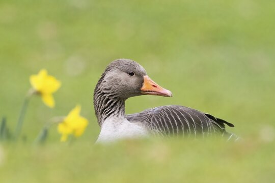 Portrait of a grey goose (Anser anser) in a meadow in spring next to daffodils, Hesse, Germany