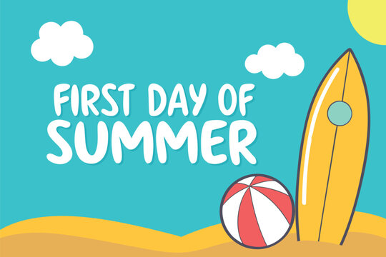 First Day of Summer text with surfboard beach ball and sun on blue background vacation holiday