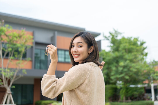 Woman buying or rent new home she holding key front of new house. Surprise happy young asian woman giving house key and smile to rent or purchase apartment home. Moving relocation concept.