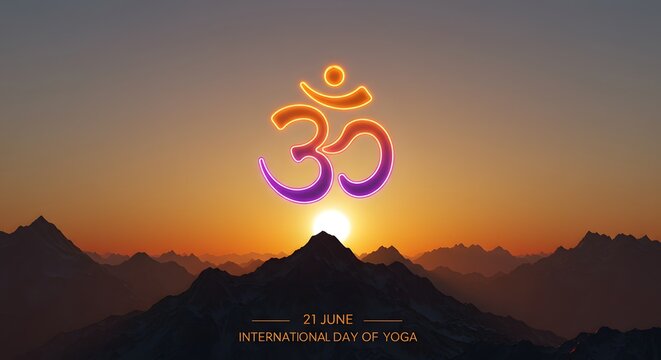 Aum symbol over mountains at sunset for international day of yoga on june twenty first