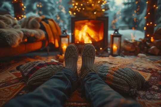 Cozy Winter Evening by the Fireplace With Warm Blankets and Lights