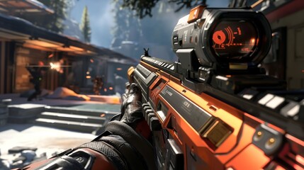 First person shooting shooter game point of view, gaming character holding rifle gun