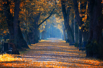 A beautiful autumn morning in the first rays of sunshine in the park in Żywiec (Silesian Voivodeship, Poland)