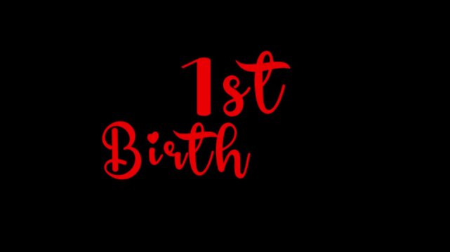 1st birthday text word cursive elegant handwritten video animation, happy first year birthday calligraphy animated lettering reveal celebration for greeting card, events red type on black background
