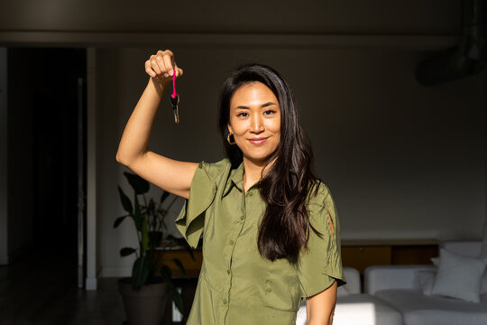 Happy woman holding key to new home during real estate recession. smart investment for first time homebuyer with successful mortgage and property purchase