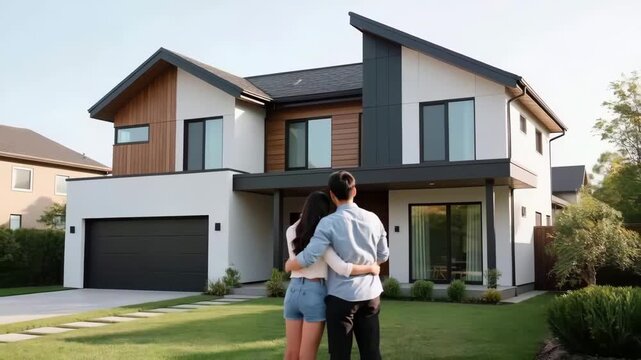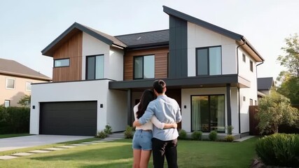 First time homebuyer loan concept. Couple Embraces Modern House Excitement of First Time Homebuyer Loan and Dream Possibilities