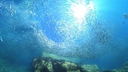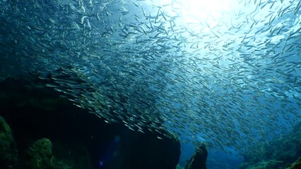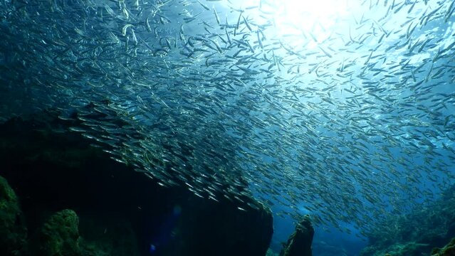 silversides hiding behind secret rocks  under sun shine and beams underwater silverside fish school wavy sea protection ocean scenery behaviour backgrounds