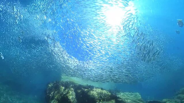 Fish in the ocean. A large school of fish swim in circles in the ocean.