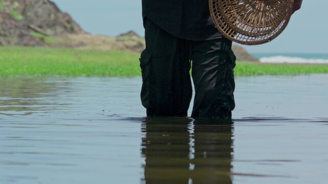 A fisherman carries a traditional fish trap made of bamboo
