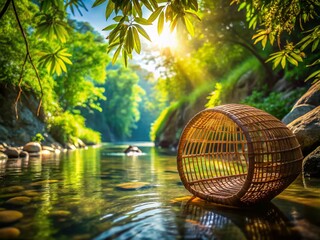 Bamboo Fish Trap Landscape Photography: Serene Asian River Scene with Traditional Fishing Gear