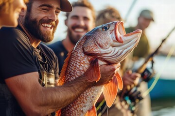 Friends celebrate big fishing catch during sunny afternoon by the lake