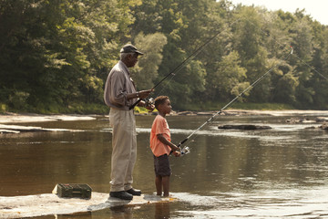 Grandfather and grandson fishing in river