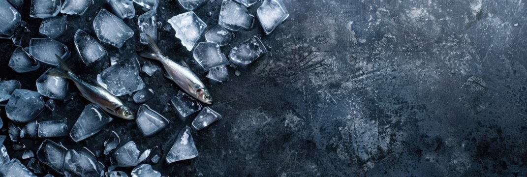 horizontal banner for fish market, fresh seafood, sardine lying on crushed ice, ice cubes, food preservation, gray background, copy space, free space for text
