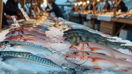 fresh colorful fishes on ice in the fishmarket in barcelona