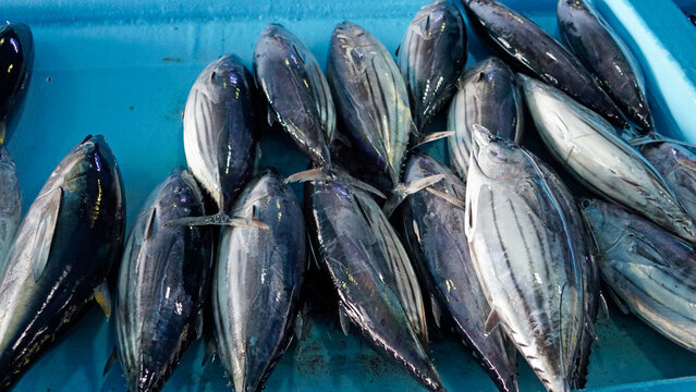 Two whole fresh tuna fish rest on crushed ice display. Prepared for sale at a busy seafood market counter. Indicates prime quality seafood, ocean catch for culinary delights. Healthy food ingredient.