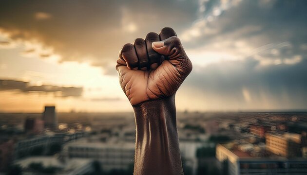 Closeup of fist clenched in the air. Power, victory, revolution concept.