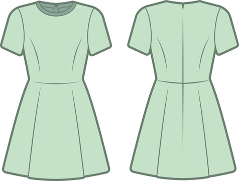 Womens short sleeve fit and flare dress technical flat sketch, front and back view, fashion cad drawing vector illustration design