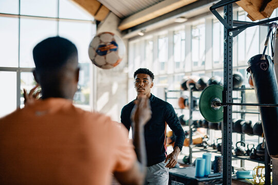 Diverse group of fit young men in sportswear tossing a ball around while warming up for a workout session together in a gym