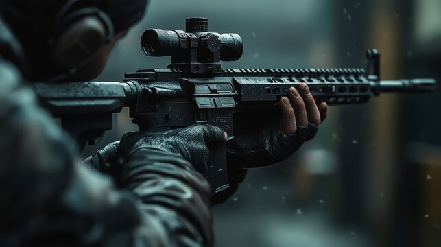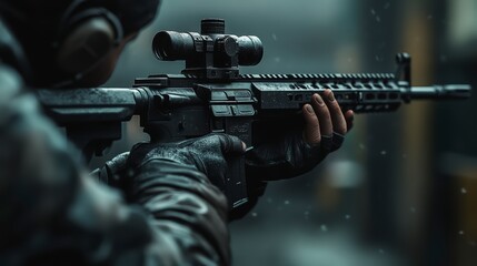 fit athlete caucasian females with rifle gun aims at target, wearing military gear, in an abandoned building. focused confident brunette ladies are ready to shoot at enemy, aiming weapon at target