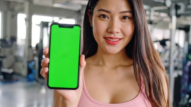 Asian Woman Smiling, Holding Smartphone with Green Screen in Gym - Fitness App