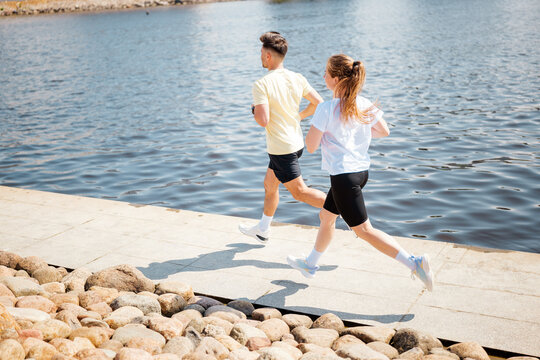 Young couple jogging along a scenic waterfront path in summer
