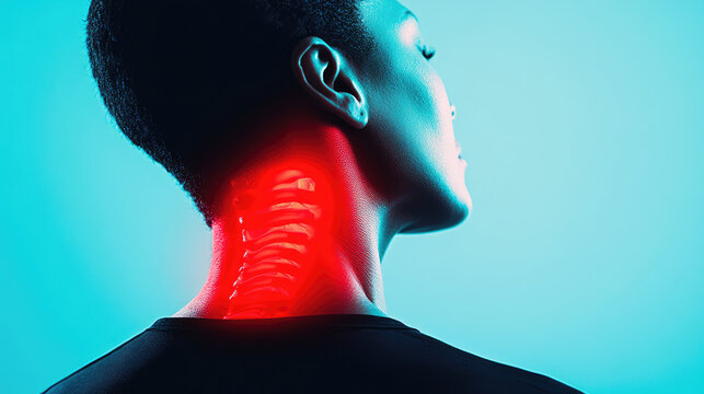 striking image of person with highlighted neck area, spine in vivid red against blue background. This visual emphasizes anatomy and health awareness