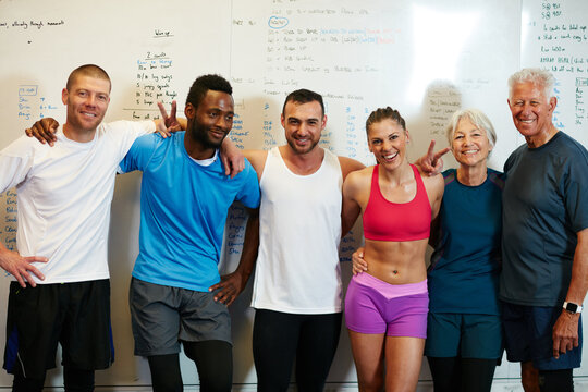 Portrait, whiteboard and people in gym for fitness, workout or training planning together for class. Happy, wellness and group of athlete friends for exercise schedule in morning in sports center.