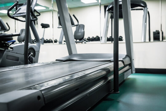 Treadmill in a gym with exercise equipment and workout area in daylight. Fitness.