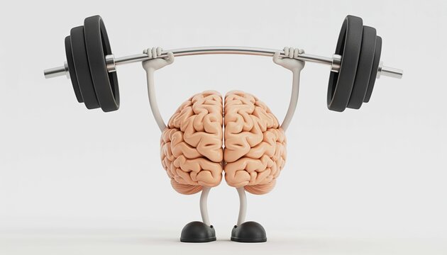 A 3d human brain with arms and legs suggests a strong, weightlifting workout for mental fitness, using its power to lift heavy ideas like a barbell in the gym, isolated for health and bodybuilding