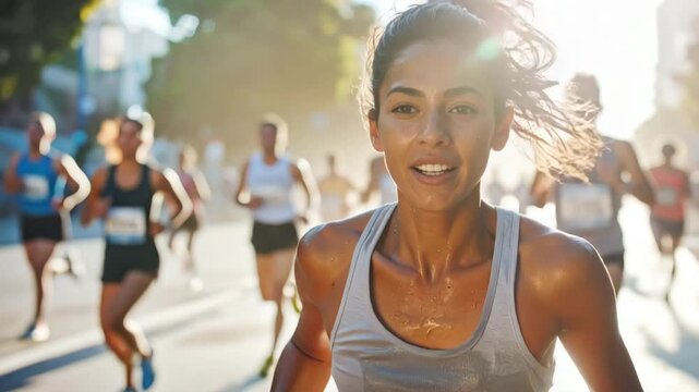 Young woman running on city street surrounded by athletes in sunny conditions showcasing determination and fitness during event