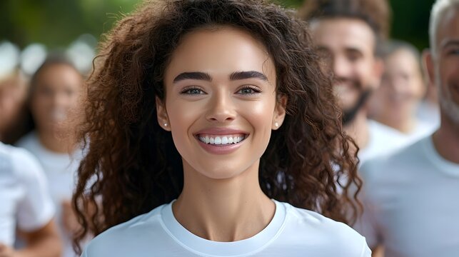 Diverse group of individuals from different ages ethnicities and backgrounds running together in a charity race or event with enthusiastic joyful expressions