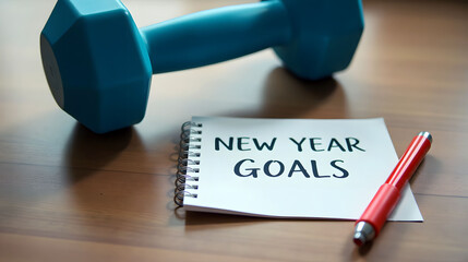 New Year's goals written on a notepad with a blue dumbbell and red pen on wooden background