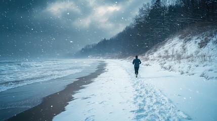 A lone man runs along a snowy beach. Perfect for articles about winter running and fitness goals.