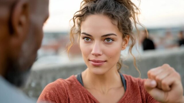 Young woman engaged in outdoor boxing training session at sunset with coach