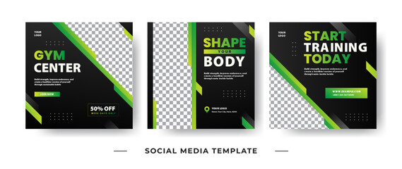 Green Fitness Gym Social Media Post Template Set with Photo Placeholder, Modern Promotion Design