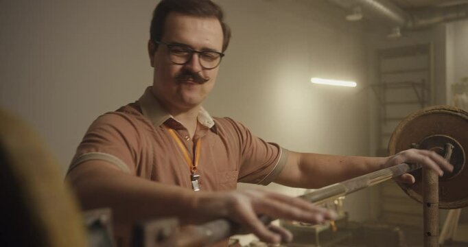 Weightlifting Coach Struggles with Barbell in Old-School Gym