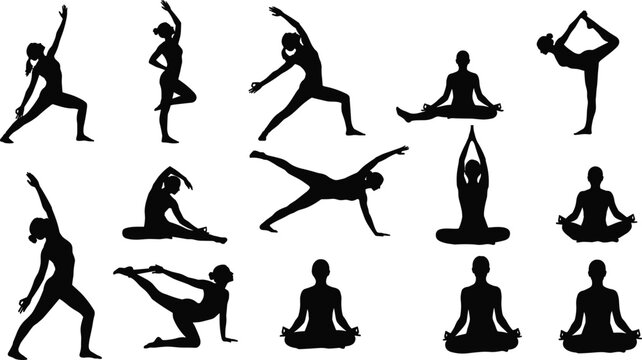 Yoga pose silhouettes in standing, seated, balancing positions, Warrior, Tree, Dancer, Lotus, vector illustration, black silhouettes, flexibility, balance, mindfulness, wellness