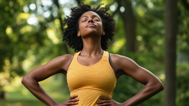 A woman in a yellow top is standing with her hands on her hips, embodying positivity and strength.