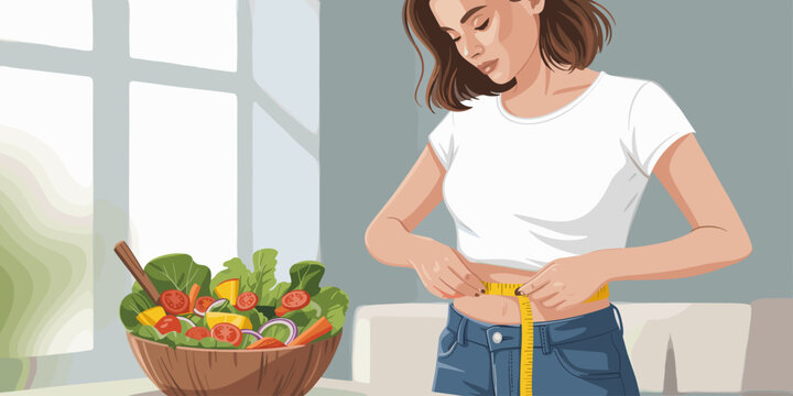 Young woman measuring waist with tape next to healthy salad for diet and weight loss concept female fitness lifestyle illustration nutrition and wellness program for healthcare advertising and marketi