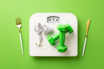 Slimming concept. Top view photo of cutlery fork knife dumbbells tape measure and scales on isolated green background