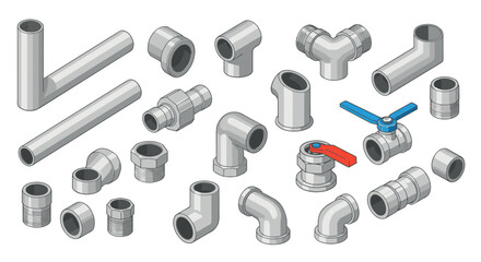 Industrial pipes installation displays complex arrangement with numerous pipe fittings and connections. Piping system is essential for fluid or gas transport within factory, refinery,