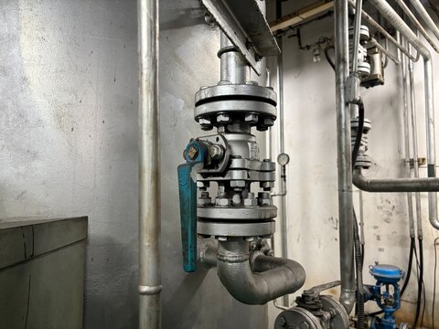 a complex industrial plumbing system featuring a metallic valve with a distinct blue handle. The surrounding network of pipes, gauges, and fittings is well-lit, revealing a clean and operational envi
