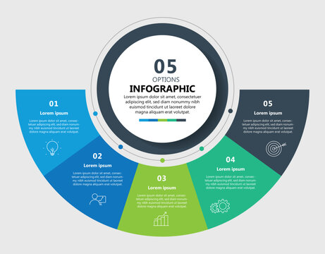 Circular infographic chart with five colored segments showing numbered options, icons, and placeholder text for data presentation and business concepts