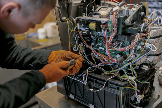A man repairman makes repairs and repairs electronics in a home appliance repair shop