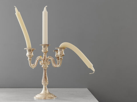 Candlestick with straight and bent candles. Creative concept of male potency problems. Sexual dysfunction in men, problems with health. Metaphor of erectile dysfunction impotence.