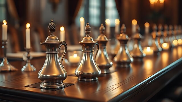 flagons. Gleaming pewter flagons on a wooden table reflecting candlelight. bar promotions, beverage menus, designed for product packaging and bar promotions, used by food bloggers.